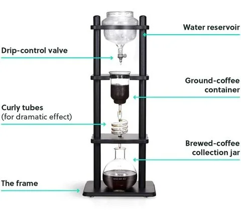 At the heart of the cold drip coffee brewing process is a multi-tiered ‘drip tower’.